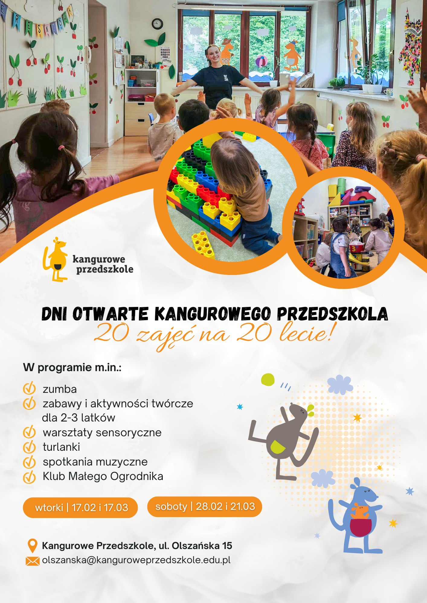 Zapraszamy na Dni Otwarte Kangurowego Przedszkola przy ul. Olszańskiej 15, pod hasłem: "20 zajęć na 20-lecie Przedszkola".